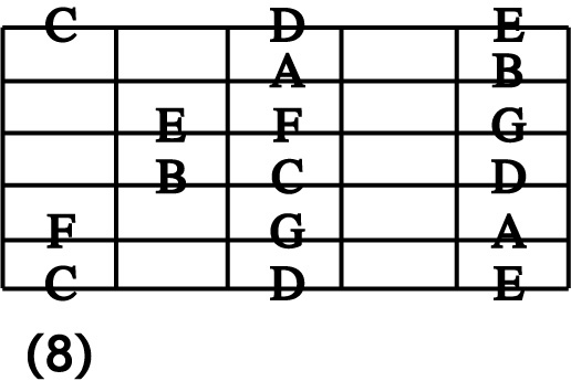 STEP 1 : C Major 5 Position Position 2 ( 8th note version ) オルタネート・ピッキングで8分音符バージョン 左手第1指(人差し指)と第2指(中指)をしっかりストレッチ(開く) してください。 |