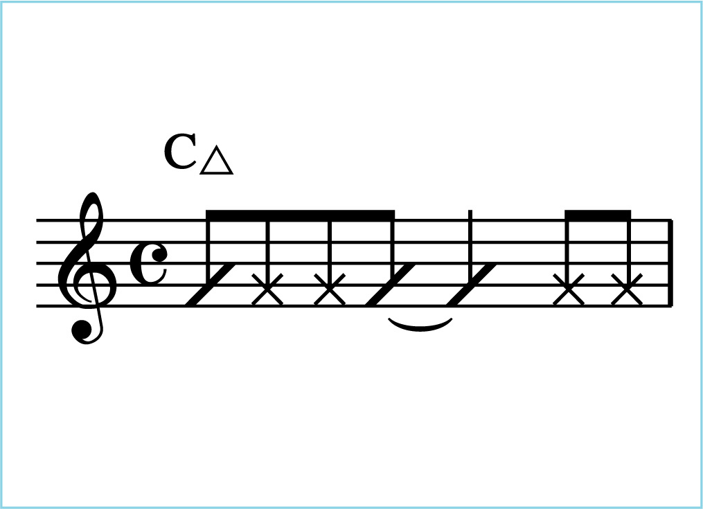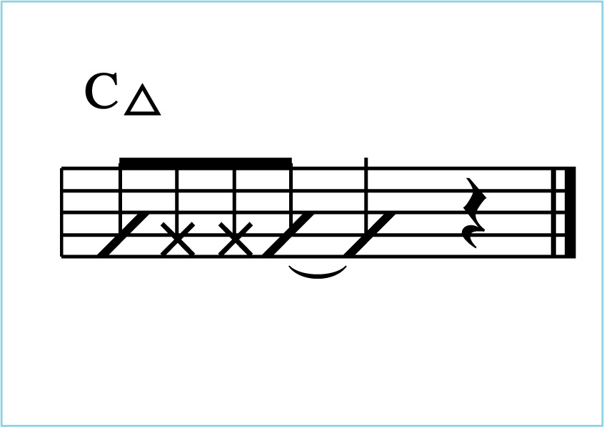 STEP 2 : Key Transpose for Rock I - IV - V ( Key = C ) 同パターンのアップ・テンポ及び別 Key のバージョン。 6弦から1弦までを、一気にカッティングして、 コードが1つの音塊になる様に、心がけましょう。 |